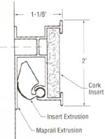 easy installation. Available in 6, 8, 10, 12 and 16 foot lengths. Rail is approx. 1" wide with a 5/8" tan cork insert (other